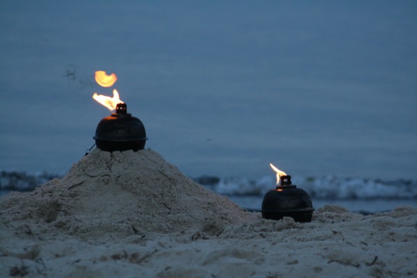 brennende Sturmfackeln tauchen den umliegenden Strand in warmes Licht